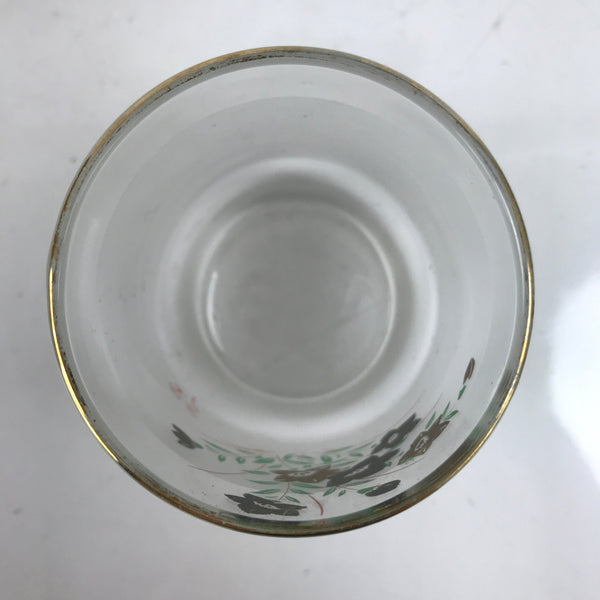 This is a Japanese vintage glass tea cup (Yunomi). It is partially frosted with a black and gold painted morning glories (asagao) floral design on the front and has a gold rim. This cup is for serving refreshing, cool drinks during summer such as barley tea (mugicha).