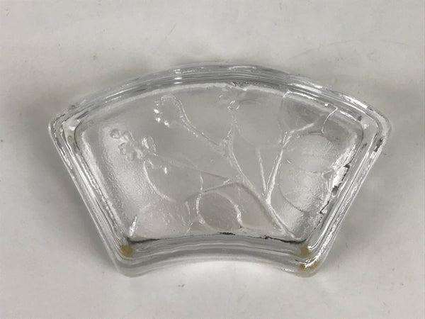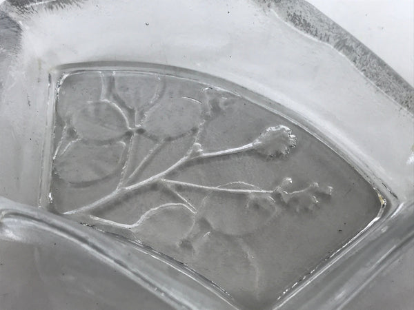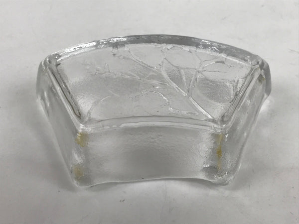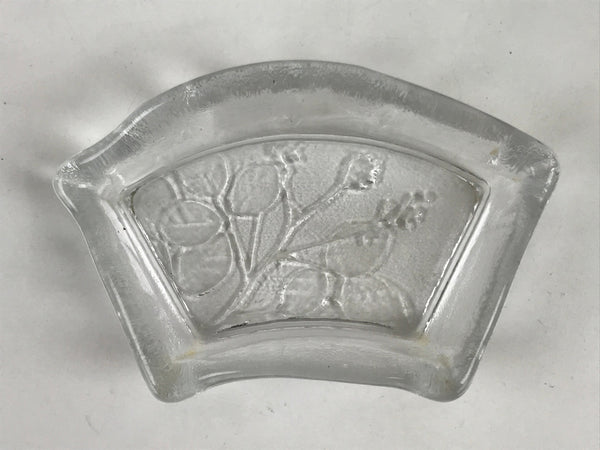 This item is a vintage Japanese serving dish in the shape of a fan. Made of Sasaki crystal, this is used for small aesthetic dishes often served during traditional multi-course kaiseki meals, as well as a dipping bowl for soy sauce and other condiments when eating sashimi. It features an embossed image of bush clover/Japanese clover (hagi).