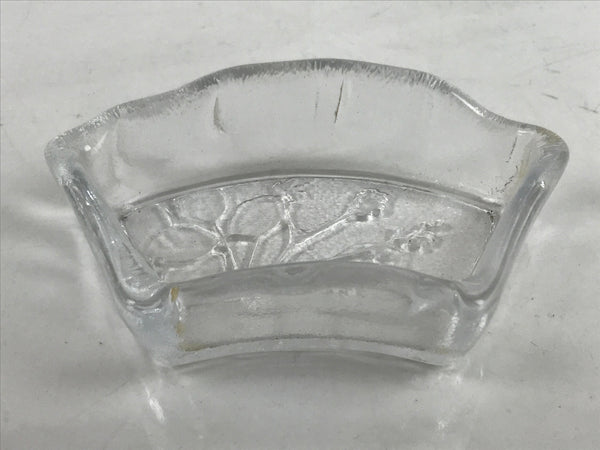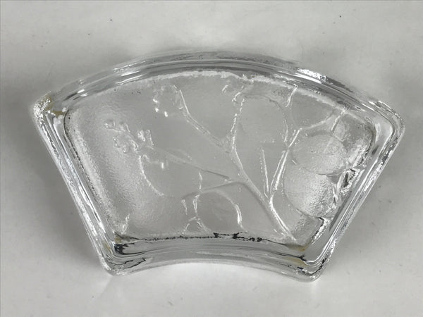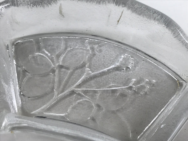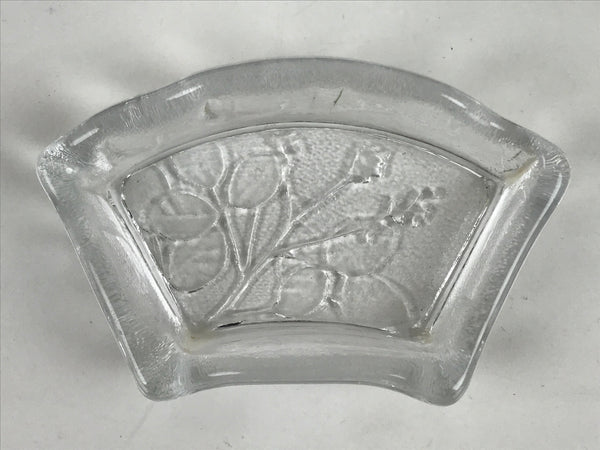 This item is a vintage Japanese serving dish in the shape of a fan. Made of Sasaki crystal, this is used for small aesthetic dishes often served during traditional multi-course kaiseki meals, as well as a dipping bowl for soy sauce and other condiments when eating sashimi. It features an embossed image of bush clover/Japanese clover (hagi).