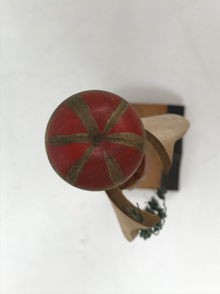 This vintage Japanese bamboo kokeshi figurine represents a woman dressed in a kimono with a red obi, and wearing a gold an red round hat. The woman is holding spikes of rice in one hand. It is attached to a stand. The body of the doll and the stand are bamboo, and the head and the hat are wood.