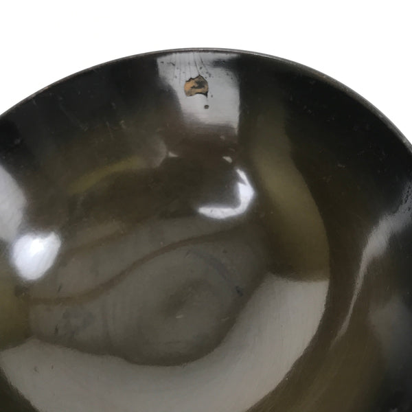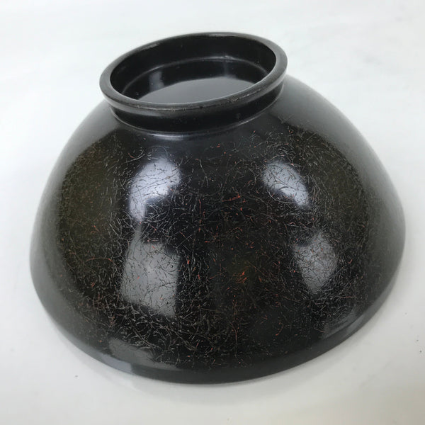 A glossy black lacquered bowl with gradient black and brown inside, this vintage lacquered wooden lidded bowl is a beautifully decorative addition to any traditional Japanese dinnerware set. The lid features a gold makie design of a bird with plants. The outside of the bowl is textured. This particular bowl is considered a nimonowan, a bowl made for boiled main dishes such as vegetables, fish, and sometimes tofu. It can also be used for soups and rice.