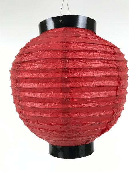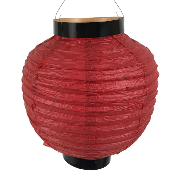 This is a vintage Japanese paper hanging lantern called chochin. This round lantern is made with thin hot pink washi paper, a thin paper, wood, and wire frame, and a wire handle. It has a simple candle holder spike on the inside.