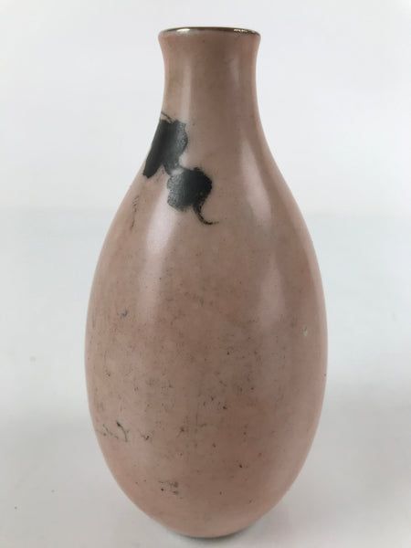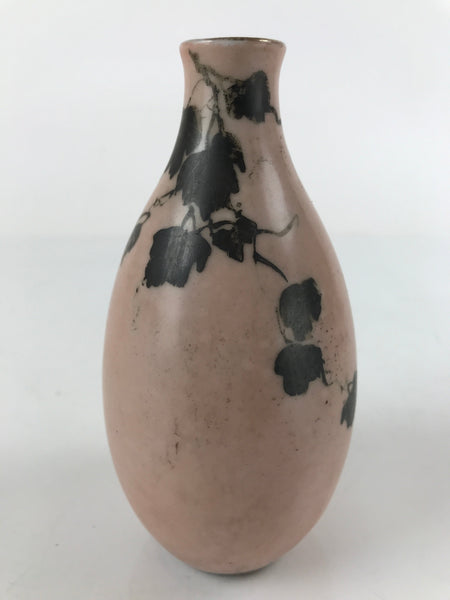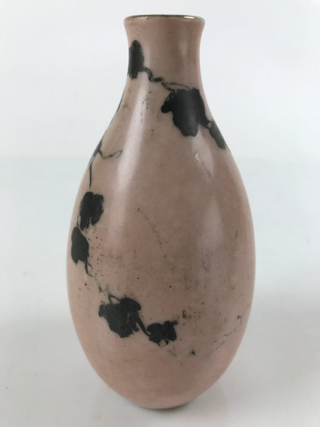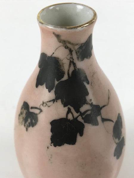 This is a vintage Japanese kutani ware porcelain sake bottle or Tokkuri. This small bottle is a light pink with black silhouetted vines and leaves draping down from the top. It has a gold rim. It is approximately an ichigo size sake bottle or a little larger. It can be also used for water, other drinks, as a vase, or as a decorative item. There is a red signature stamp on the bottom (九谷 kutani).