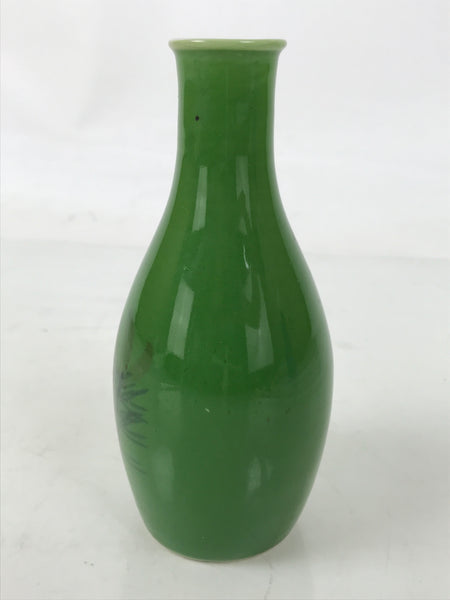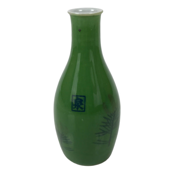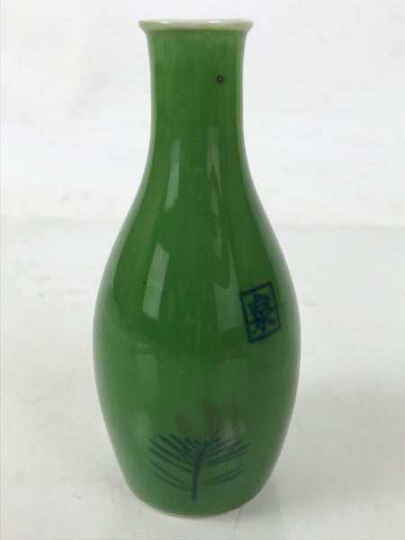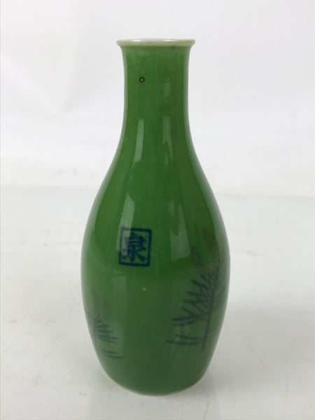 This is a Japanese vintage porcelain sake bottle, or Tokkuri. It has a grass green color with two sprigs of pine needles on one side. There is a square kanji mark at the center that says izumi (fountain). Its compact size makes it easy to use daily for beverages or as a small flower vase.