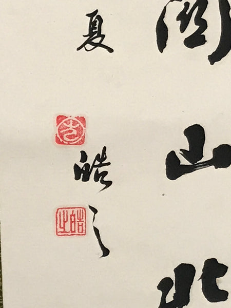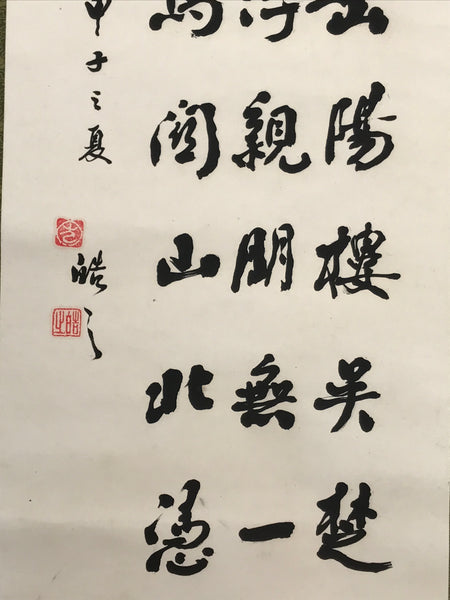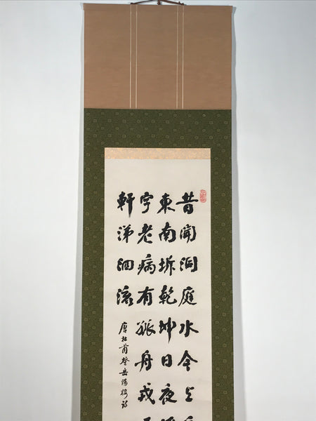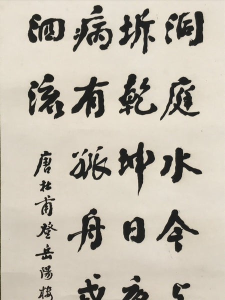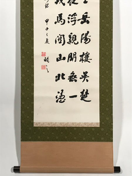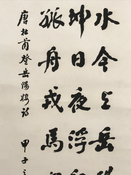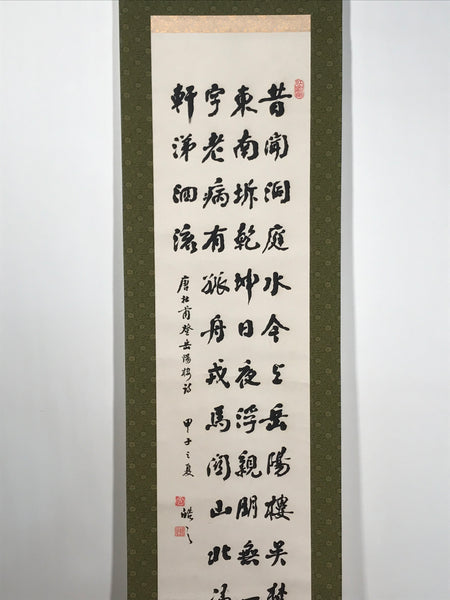 This vintage Japanese hanging scroll (kakejiku or makimono) features calligraphy of a Chinese poem (Kanshi poetry) by the Chinese poet Du Fu (or Toho in Japanese) called 'Climbing the Yueyang Tower' (登岳陽楼). This piece is titled and signed with names and red seals.