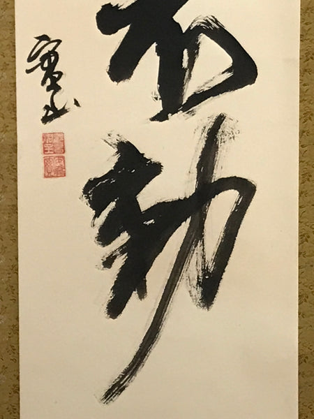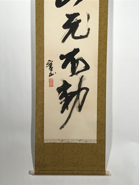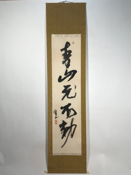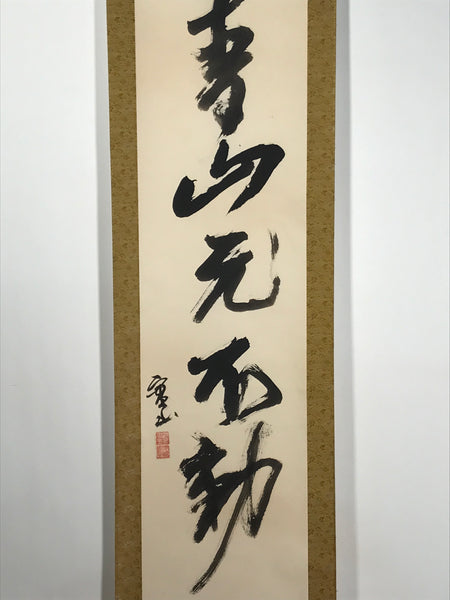 This vintage Japanese hanging scroll (kakejiku or makimono) features black-ink calligraphy with five big Japanese kanji characters: 青山元不動, translating to 'the mountains remain calm and serene'. This piece is titled and signed with a name and red seals.