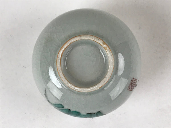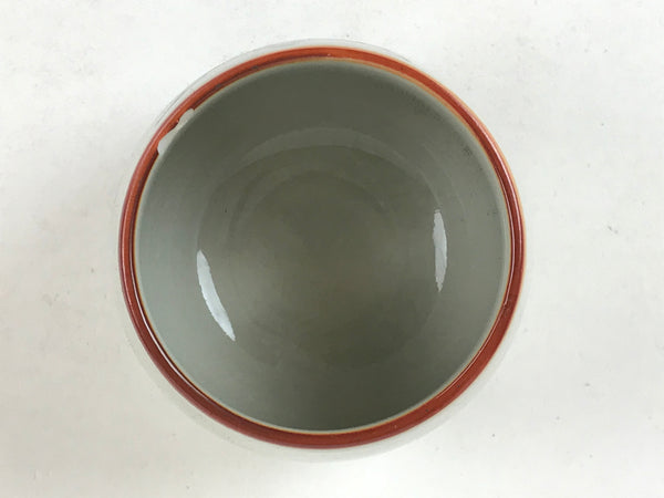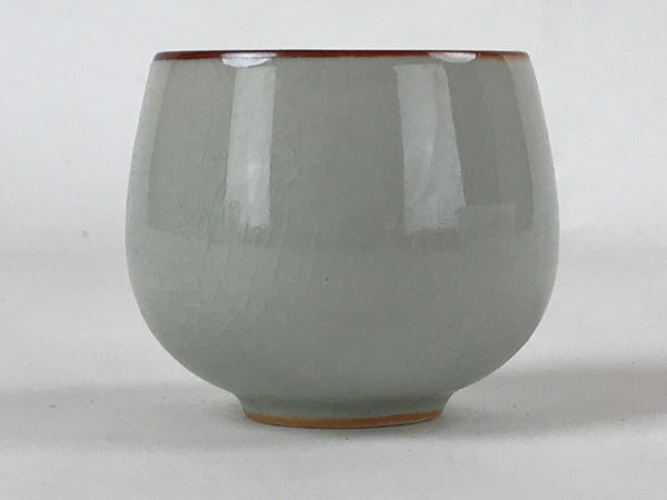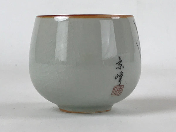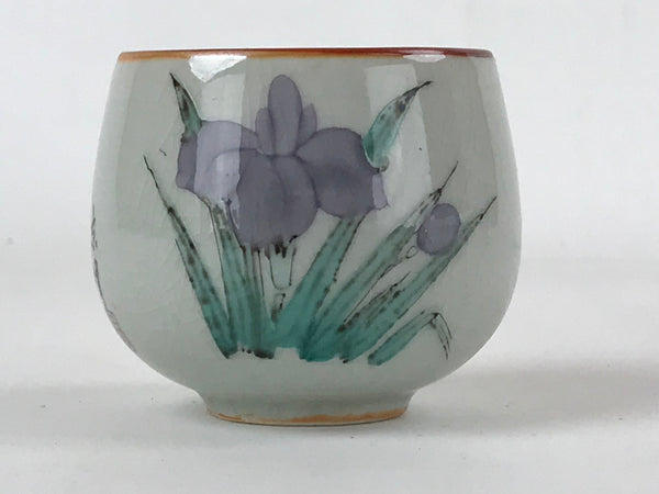 This is a Japanese vintage tea cup (Yunomi). It has a beautiful white (light gray) crackle glaze with an illustration of an iris flower in purple, green and dark brown on top and a reddish orange mouth. It is signed on the side. This cup can be used during the tea ceremony or as a small bowl to serve side dishes.