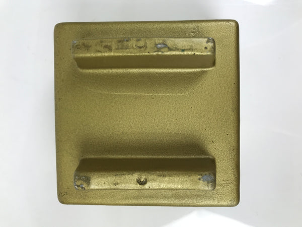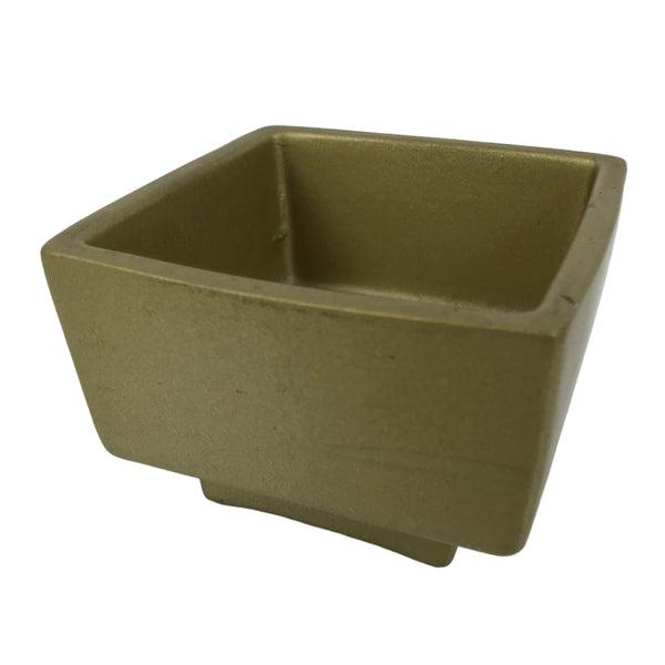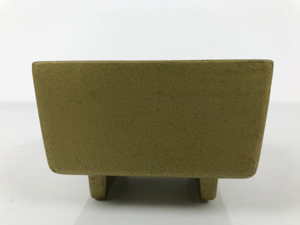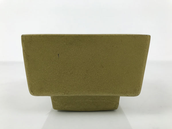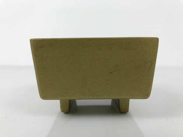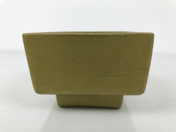 This is a vintage ceramic Japanese flower vase, or suiban. A small, deep square shape, this miniature suiban has a matte gold glaze. It sits up on two bracket legs.