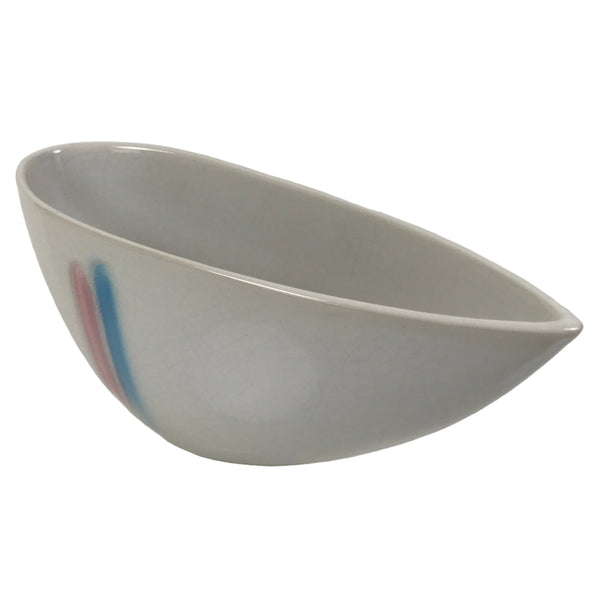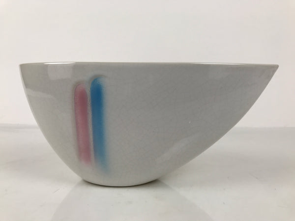 This is a vintage ceramic Japanese flower vase, or suiban. Glazed white with a blue and pink line on one side for decoration, this narrow, half-teardrop-shaped suiban vase is a unique addition to any simple ikebana arrangement.