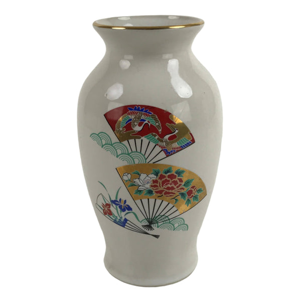 This is a vintage Japanese porcelain flower vase, or kabin. It is a classic shape with a plain white base glaze and a gorgeous red, gold, and green folding fan (sensu) design. It can be used for all types of flower arrangements both ikebana and casual.