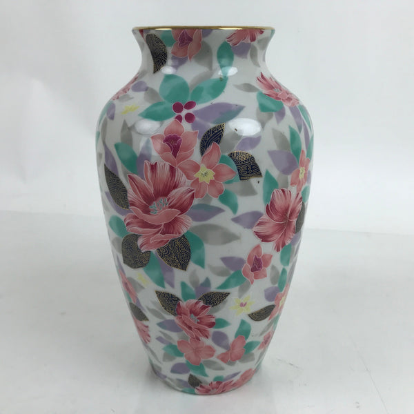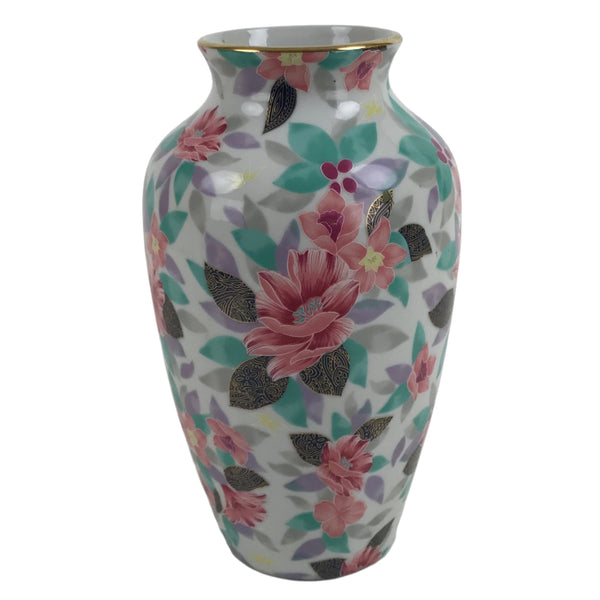 This is a vintage Japanese porcelain flower vase, or kabin. It is a classic shape with a lush floral design featuring pink camellias (tsubaki) with green leaves and gold accents. The rim around the mouth also has a gold accent. It can be used for all types of flower arrangements both ikebana and casual.