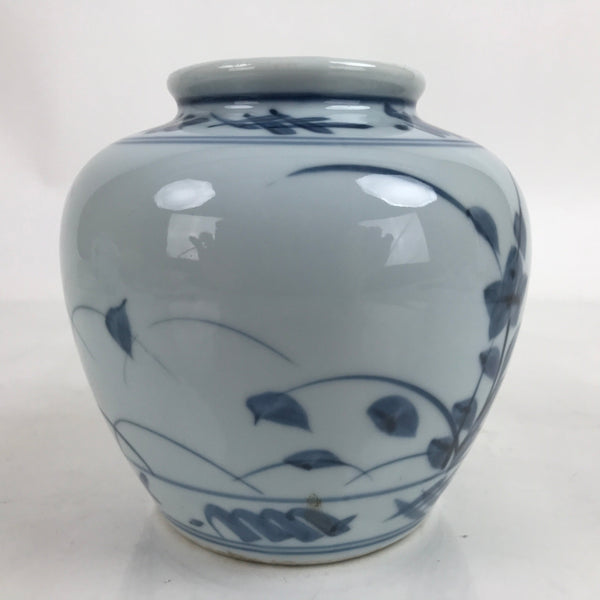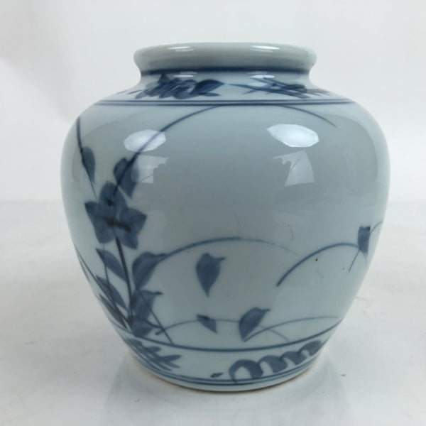 This is a vintage Japanese porcelain flower vase, or kabin. This stout pot/jar-like vase is stout with a wide mouth. It is from the pottery style called Tobe Ware which specializes in sometsuke (white and blue) porcelain pieces. This particular vase features balloon flowers/Japanese bellflowers (kikyo). It can be used for all types of flower arrangements both ikebana and casual.