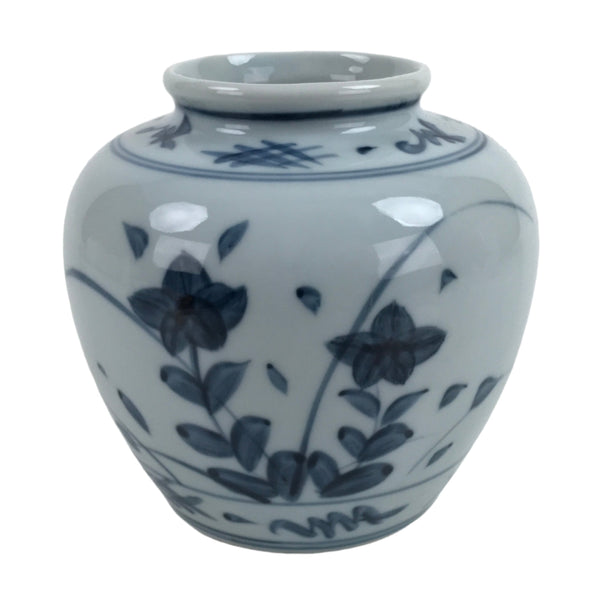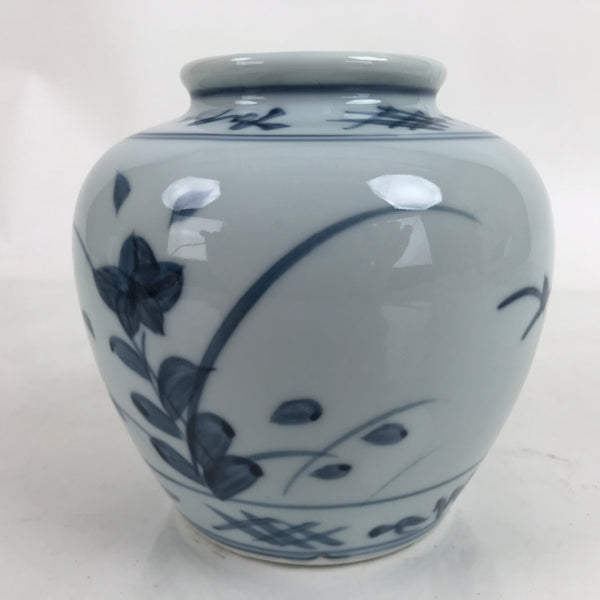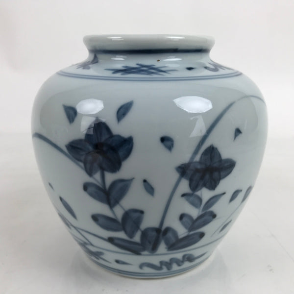 This is a vintage Japanese porcelain flower vase, or kabin. This stout pot/jar-like vase is stout with a wide mouth. It is from the pottery style called Tobe Ware which specializes in sometsuke (white and blue) porcelain pieces. This particular vase features balloon flowers/Japanese bellflowers (kikyo). It can be used for all types of flower arrangements both ikebana and casual.