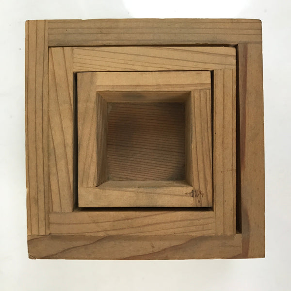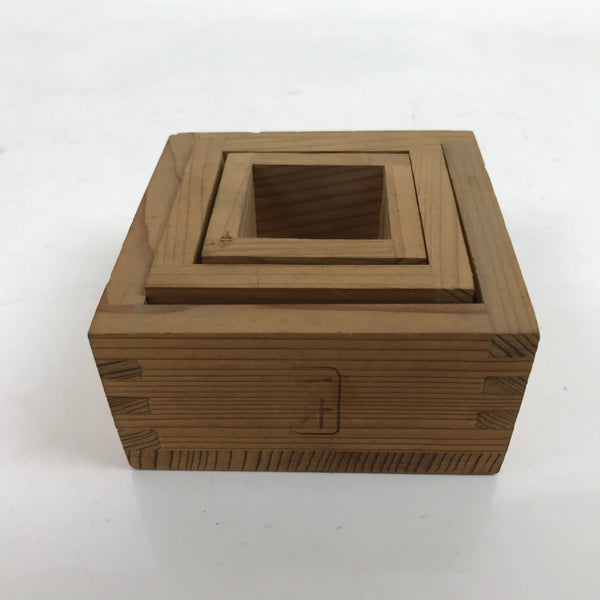 This is a miniature set of Japanese traditional measuring cups, also called masu. In a natural brown color, they stack inside each other. They have stamped kanji on the sides for measurements. These make great boxes for storage and decoration.