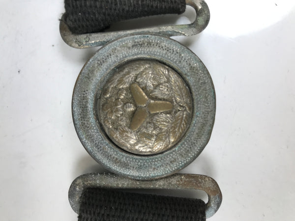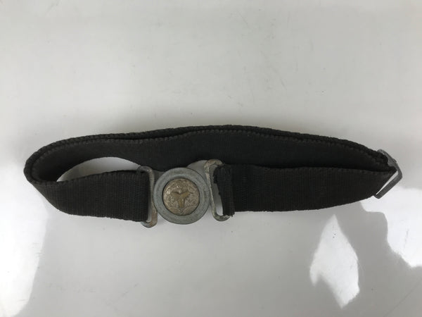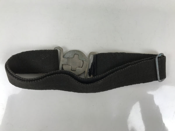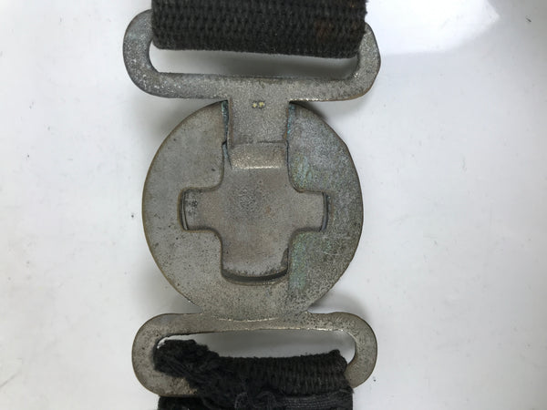 This is a vintage Japanese fireman's uniform belt. It is made of a sturdy black woven fabric and fastened together with a silver metal locking clasp. The clasp is round and fits through a cross-shaped hole that holds the belt together by tension. The clasp has a round image of an old National Fire Department crest that consists of a triangular shape with leaves and a cherry blossom.