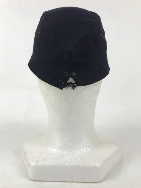 This is a vintage Japanese fireman's regular uniform hat. It is made of a navy blue fabric with metal rings at the top for ventilation. It is decorated with a red and black vinyl band across the front, indicating the hat's owner would have been a deputy division chief or division chief. There are two metal buttons on either side with a cherry blossom at the center as well as a large metal cherry blossom pin front and center.