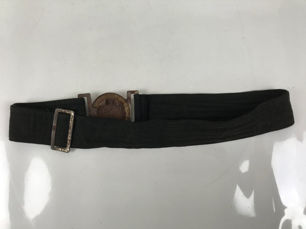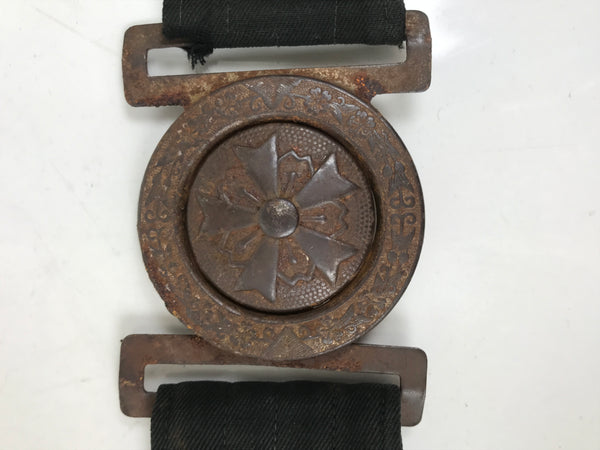 This is a vintage Japanese WWII fireman's uniform belt. It is made of black cotton fabric and fastened together with a silver metal locking clasp. The clasp is round and fits through a cross-shaped hole that holds the belt together by tension. The clasp has a round image of a cherry blossom.