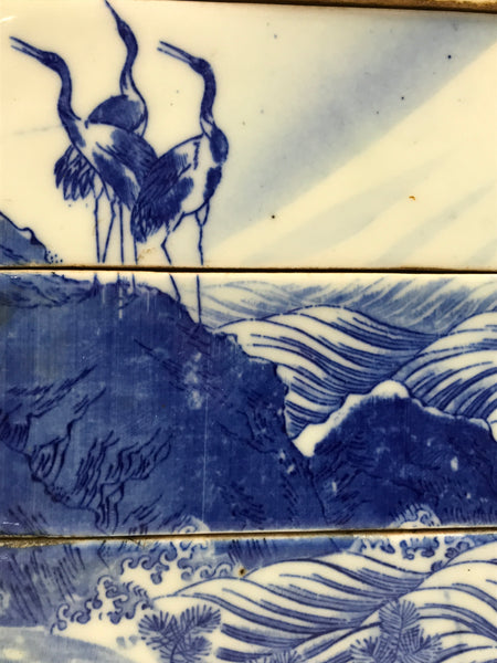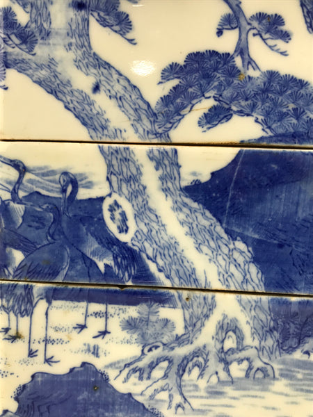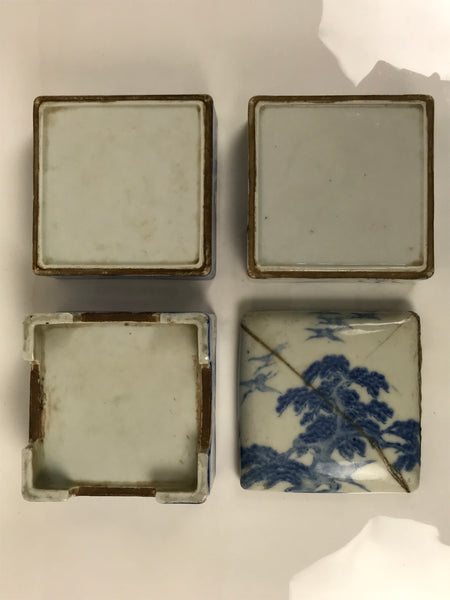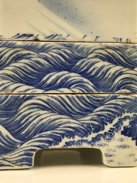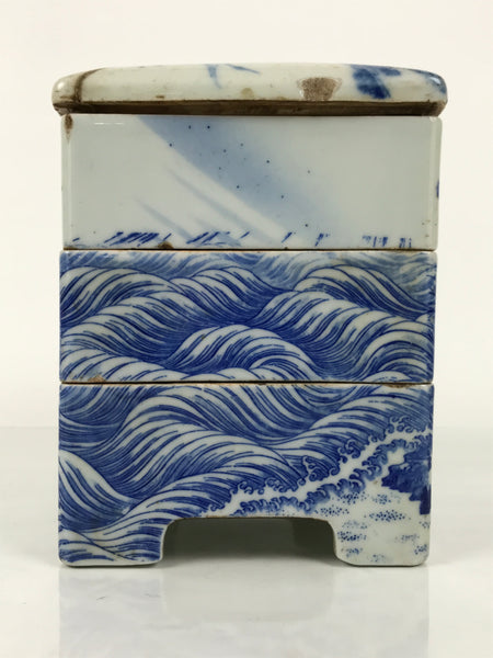 This is an antique Japanese porcelain 3-tiered rounded square bento box, or jubako, with a rounded top lid. It is a striking indigo blue on white (sometsuke) and features an ages-old pine tree beside the sea. At the base of the tree is a group of cranes with a few flying overhead. The bottom tier has simply shaped arches to make four legs and add visual interest.