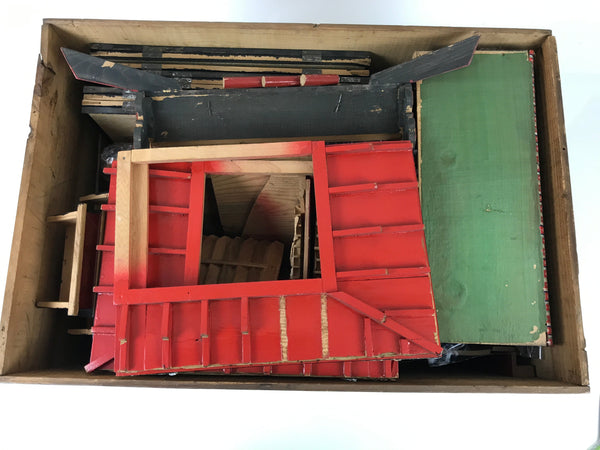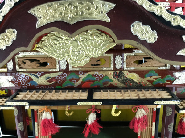 - Good condition considering age. Some pieces of the underside of roof have broken off (collected in plastic bag), byobu screens on back wall have a couple holes on back side, scratches and wear on lacquer paint from use. Wooden box has some damage around edges. Wear and tear due to age.