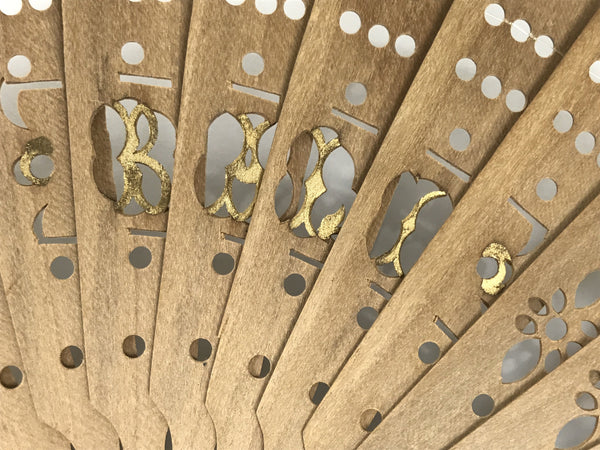 This is a traditional Chinese carved radial sandalwood fan. This uniquely-shaped fan folds small, then opens in a round shape. It has a cutout floral design throughout. It is well-made and has a medium brown color with gold accents. The pieces of this fan are attached with a strong clear plastic string, and at the very bottom is a metal loop with a red string with two tassels attached.