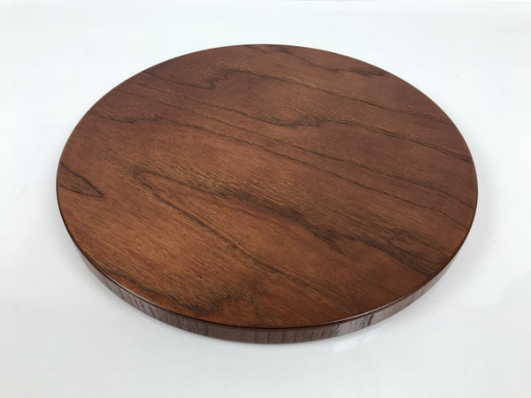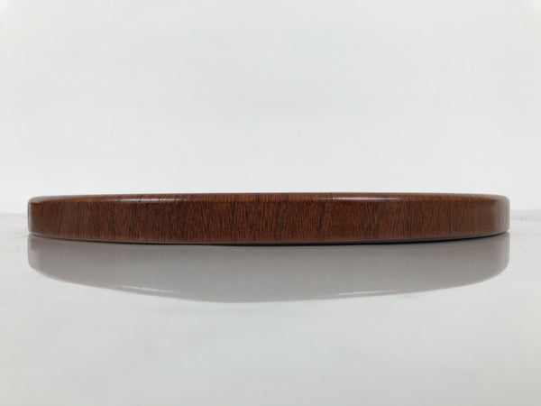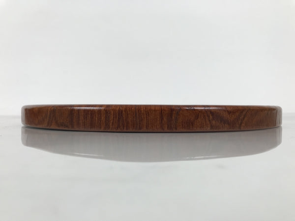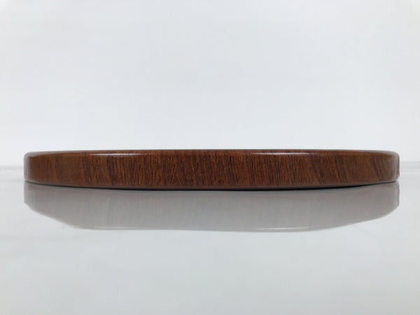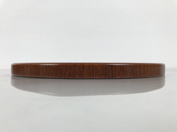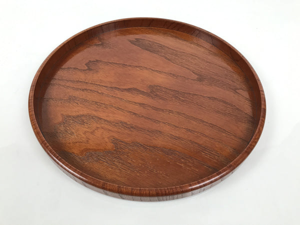 This vintage Japanese serving tray is made of wood. It is brown and brushed with a clear lacquer coating, highlighting the natural wood grain. It is round with a short raised edge so drinks cannot easily slide off.