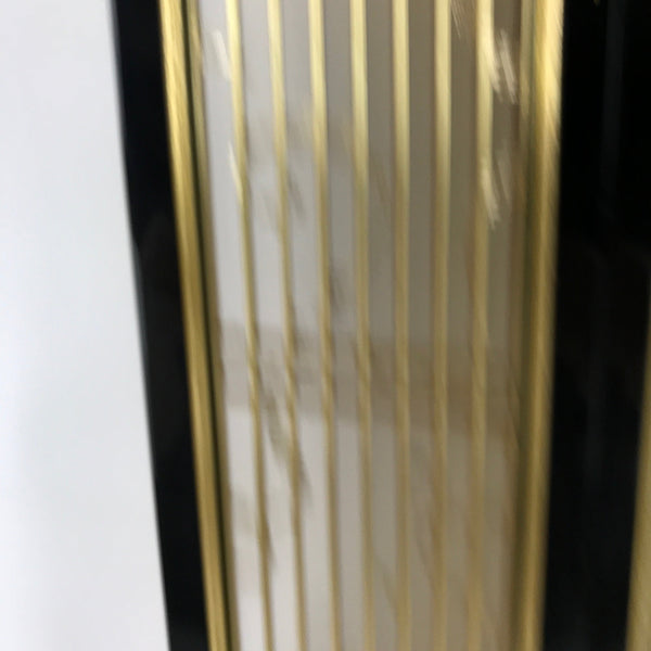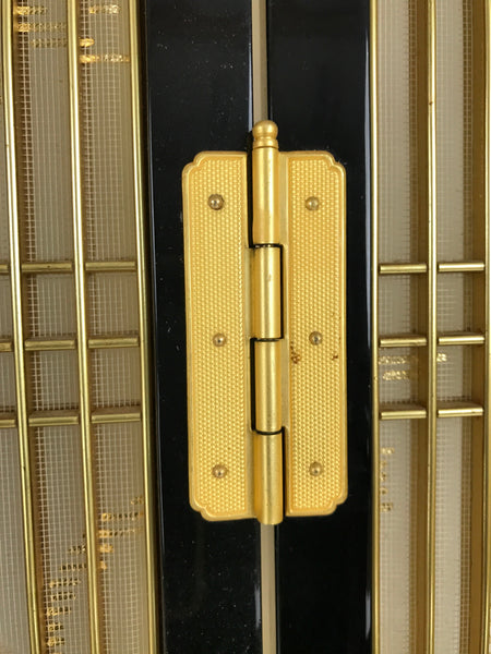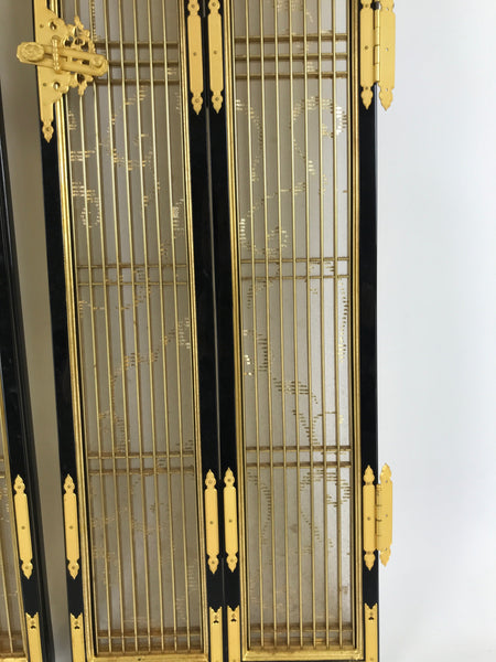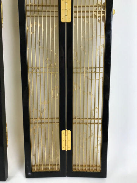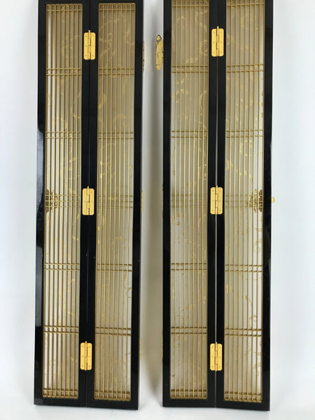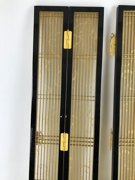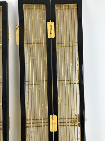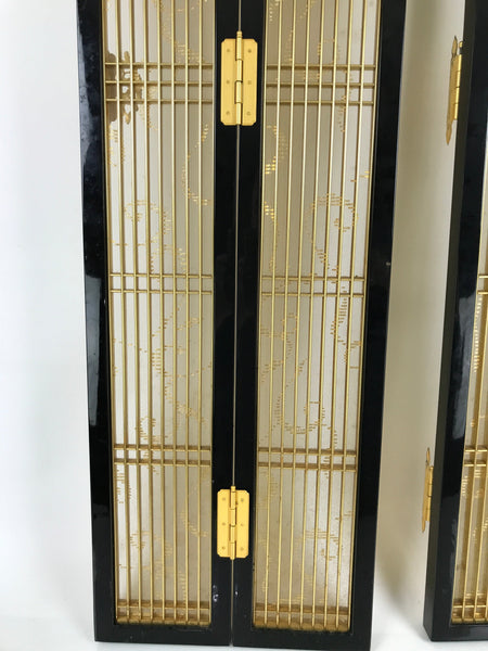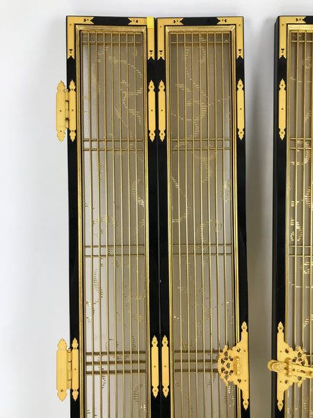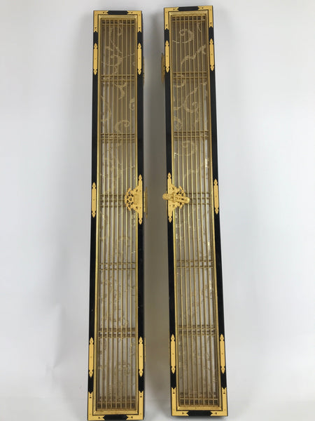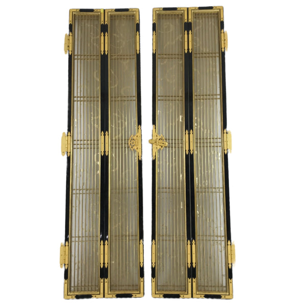 This is a 2-piece set of inner doors coming from a Japanese vintage wooden Buddhist altar cabinet. The two doors, a total of four tall panels, showcase a slatted front and back with a light mesh fabric material with a simple gold pattern on the inside for airflow. There are brass metal plate embellishments on the border as well as the hinges.