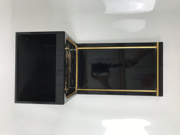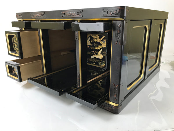 The front is separated into three sections, each with their own door that lifts up like a flap and then slides back into the cabinet. The leftmost section houses two small drawers decorated with makie gold bamboo and momiji maple leaf designs. The center and rightmost sections have a pull-out tray with a secret compartment on the back end. One has a gorgeous makie image of flying cranes while the other has two mon symbols with bamboo and peonies.