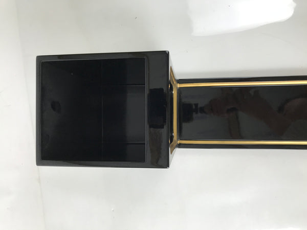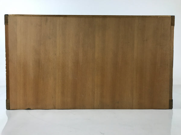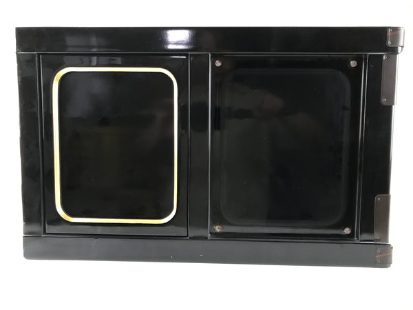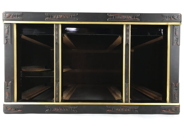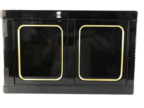 This item comes from a Japanese vintage wooden Buddhist altar cabinet. This is the base piece that the main altar stands on and is mainly used for storage. It is made of wood and lacquered mostly black with gold accents and brown metal border plates for decoration. The top side is bare wood, but flat.