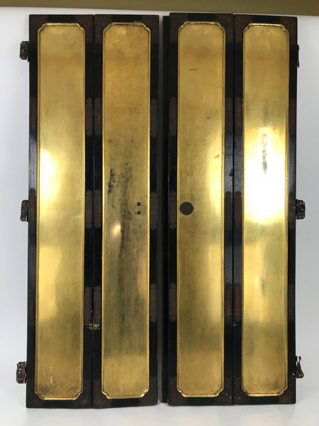This is a 2-piece set of outer doors coming from a Japanese antique wooden Buddhist altar cabinet. The two doors, a total of four tall panels, showcase black lacquer on the front with brushed lacquer centers and metal border decorations and front latch, while the back side is black lacquer with gilt gold leaf decorating the centers of each panel. The front latch piece has a peony and chrysanthemum design. The hinges on the outside edges are plain metal.