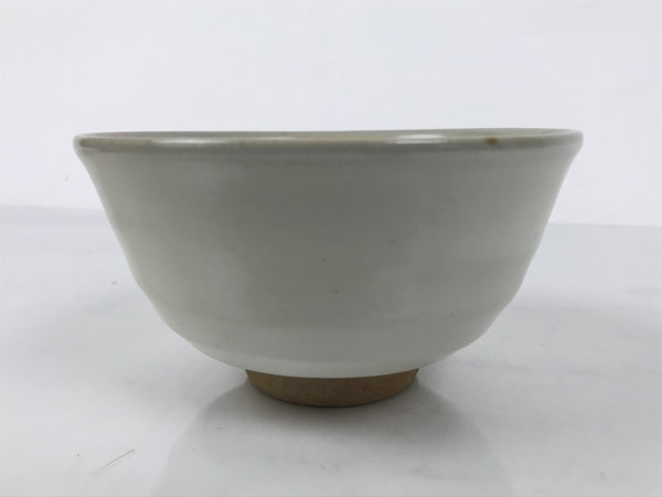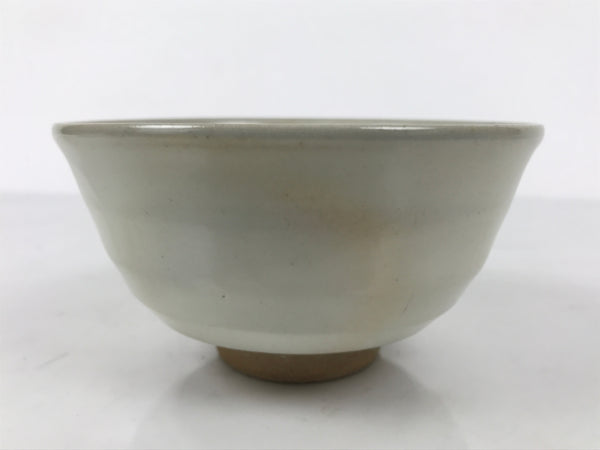 This is a vintage Japanese ceramic green tea bowl or matcha chawan in the Hagi ware style. It is off-white with orange accents. There is a signature around the foot.