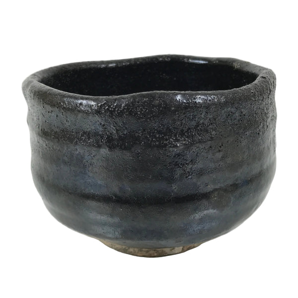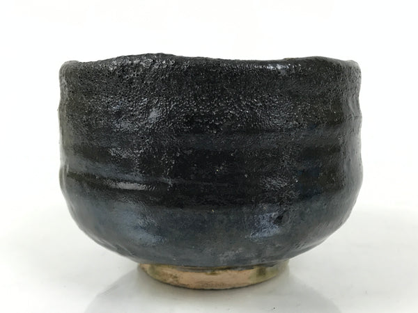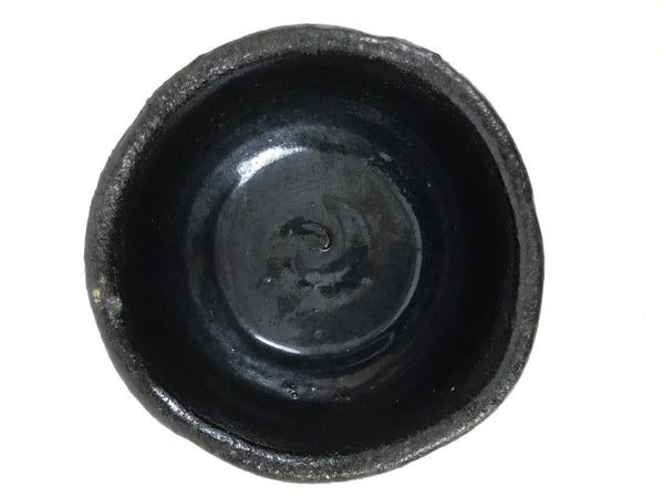 This is a vintage Japanese ceramic green tea bowl or matcha chawan. It is in the Raku ware style. This bowl has an irregular rim and a black glaze with a different texture between the upper and lower parts; the upper is slightly rough, and the lower is smooth. The outside has wheel-throwing rings, Rokurome.