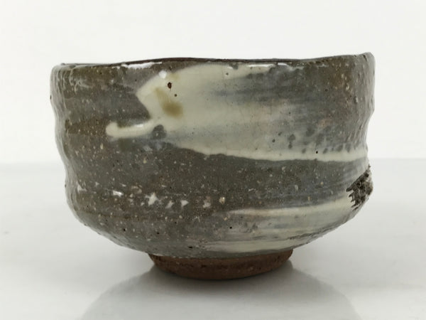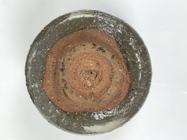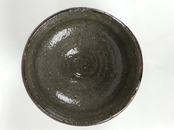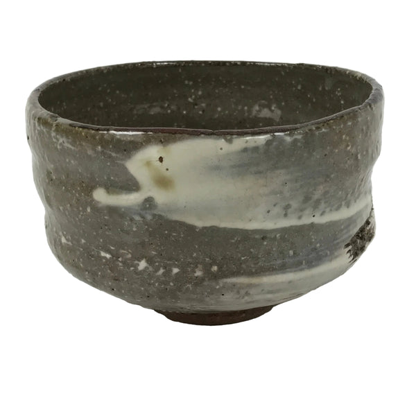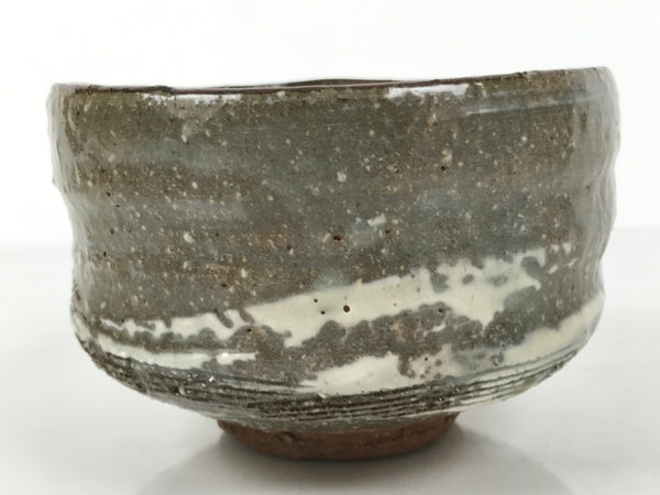 This is a vintage Japanese ceramic green tea bowl or matcha chawan. This bowl has a glossy gray glaze on an earthy brown base. It features a speckled texture, a white brushstroke pattern(hakeme), incised lines, and wheel-throwing rings (rokurome).