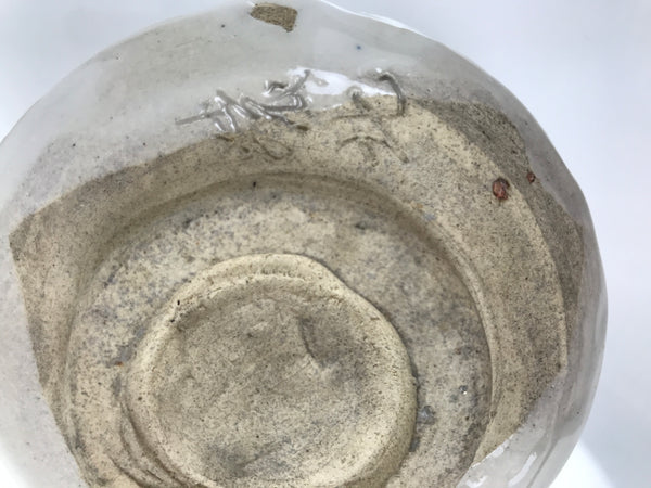 This is a vintage Japanese ceramic green tea bowl or matcha chawan. This thick bowl is glossy white. It has a Rokurome pattern on the side and hand-formed irregularity on the rim. There is a signature near the foot.
