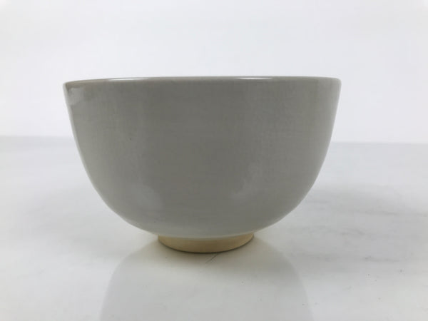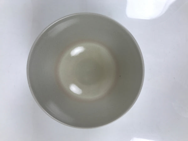 This is a vintage Japanese ceramic green tea bowl or matcha chawan. It is off-white with pink accent inside. There is a signature around the foot.