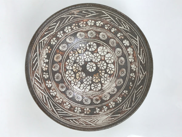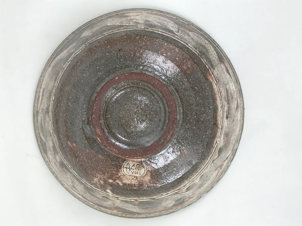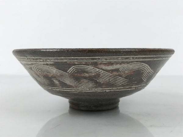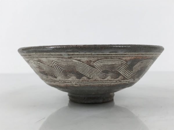 This is a vintage Japanese ceramic green tea bowl, or matcha chawan. It is in the Mishima ware style. This gray bowl features carved and inlaid white patterns, floral inside, and waves outside. It has brown tones that appear to be a clay base visible through the glaze or a kiln effect during firing. It has a signature around the foot.