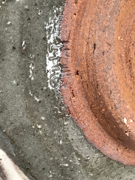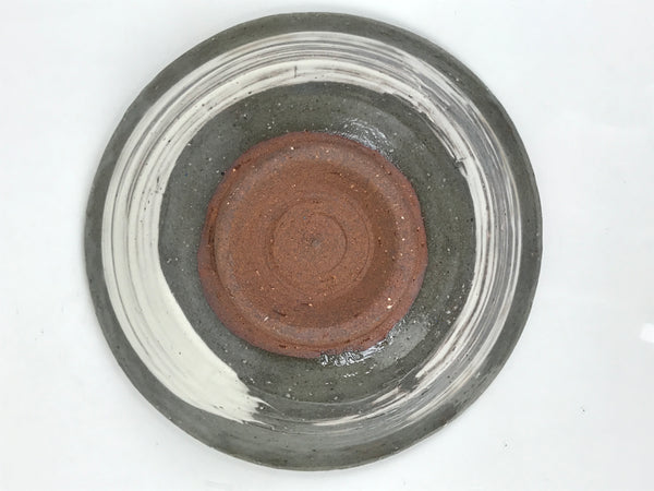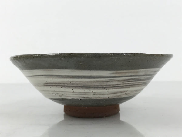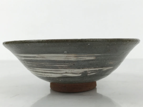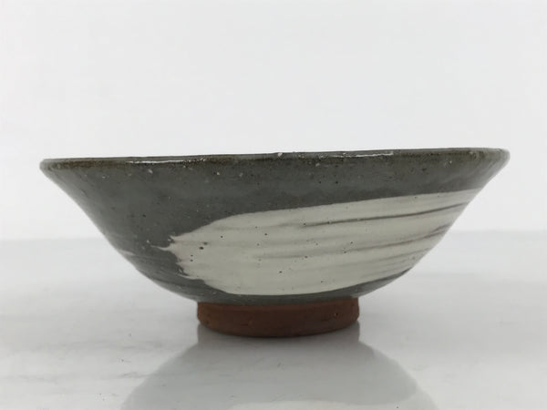 This is a vintage Japanese ceramic green tea bowl, or matcha chawan. It features a white brushstroke pattern on a gray glaze. It has a speckled texture from an earthy brown base. The sign is stamped around the foot.