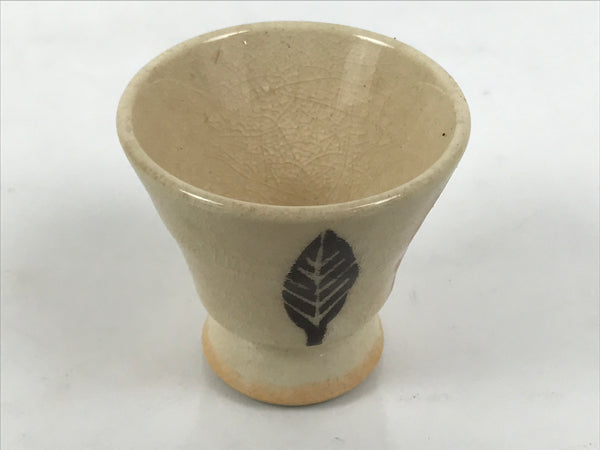 This is a vintage Japanese ceramic sake cup. This particular type of cup is called rappa or "horn type" due to its resemblance to a trumpet or other horn instrument. In terms of size, it is also called ochoko. This is a footed cup with a beige crackled glaze with three brown and blue colored leaves decorating the sides.