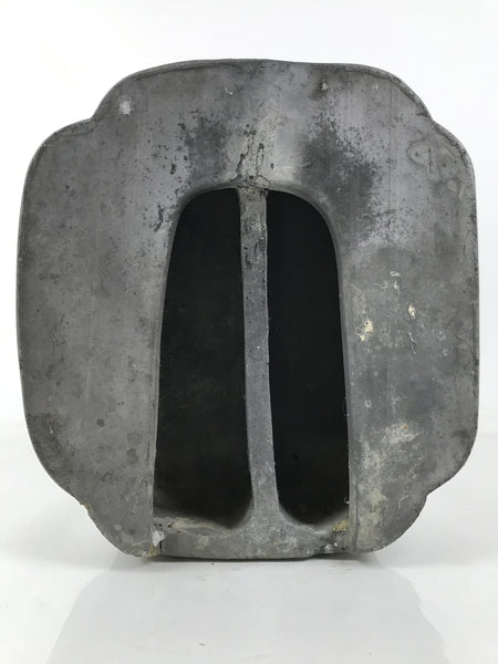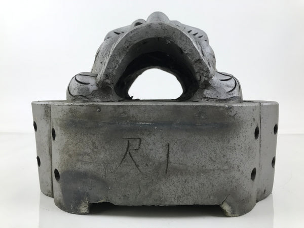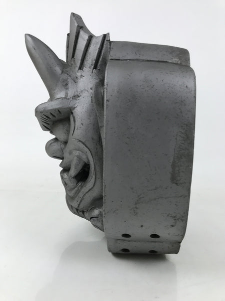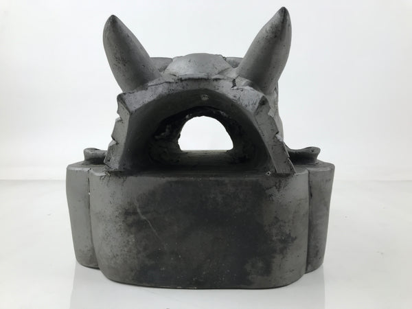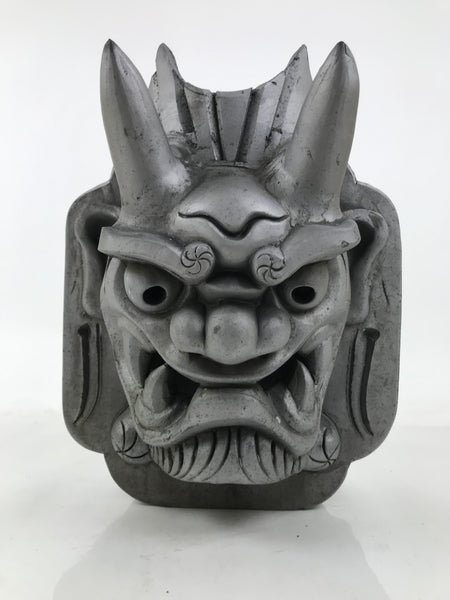 This is a Japanese sculpted clay oni demon roof tile (kawara) decoration often found on temples and sometimes private residences. Also called onigawara, this large and heavy ridge-end tile acts as an amulet to frighten off evil spirits and ward off misfortune and disaster. It has horns and piercing eyes with a semi-open mouth. It can be installed on a building but is also perfect for general eye-catching decor.