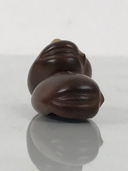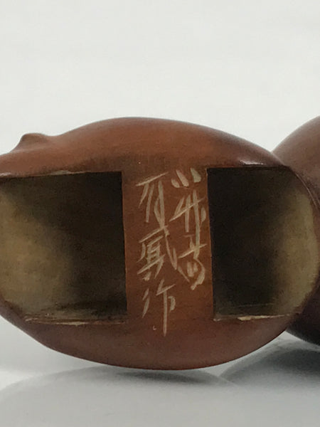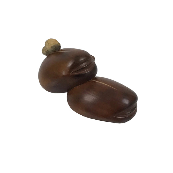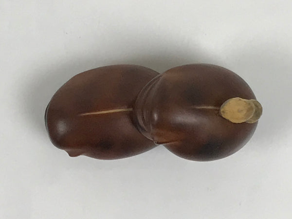 This vintage Japanese obidome, a decorative item similar to a brooch affixed to the front of an obijime, is carved from boxwood and depicts soramame beans. The item is signed by the craftsperson on the back. It comes with the original wooden box, which has writings and read seals on the lid.