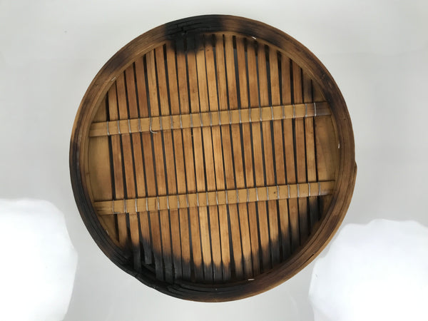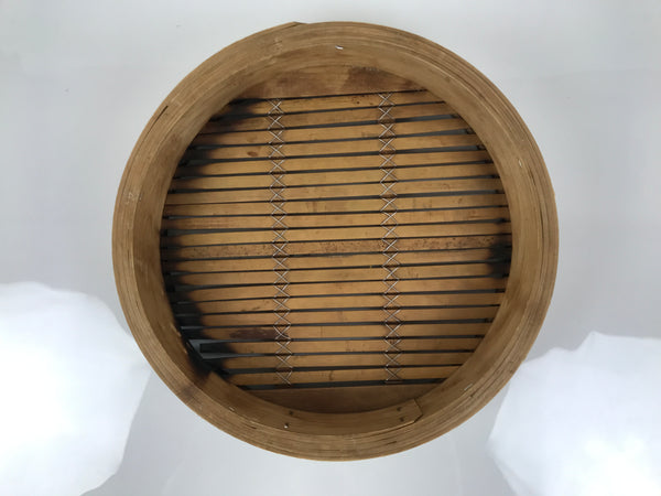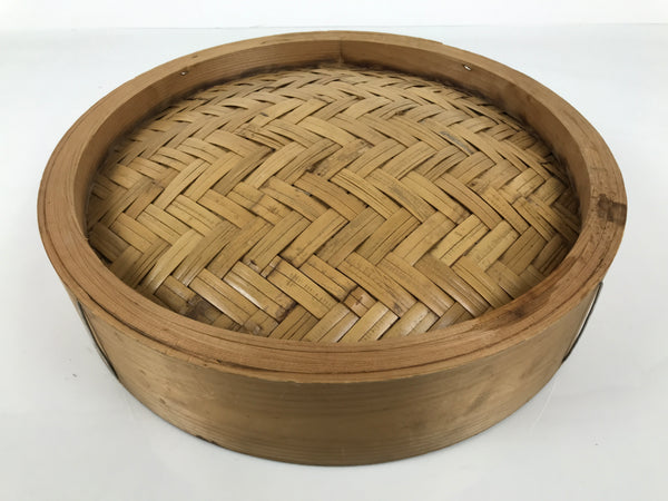 This vintage Japanese wooden steamer, or seiro, is made of wood and has a mat made of bamboo on the inside. It is a natural wood brown color.