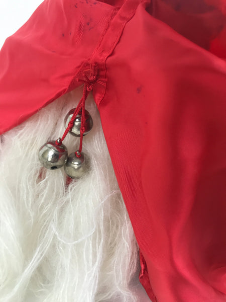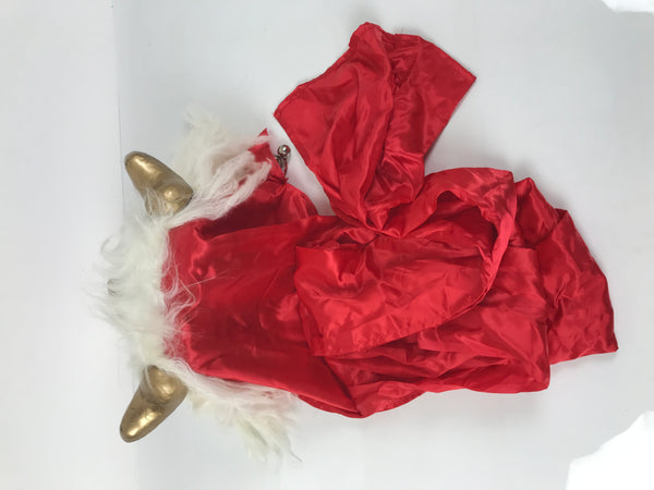 This is a Japanese lacquered wooden shishi lion mask. Also called komainu, these lion dogs are often depicted as guardian statues outside of temples. They are also famous for shishi-mai, or lion dance (which has a Chinese equivalent). This gorgeous piece can be used for room decoration or shows and dances. The mouth opens and closes on a wooden frame and hinge attached to a string, and the ears are adjustable/removable. It has a long red silk fabric panel covering the back side. There are clusters of bells attached to either side of the back of the head. It comes in a paper box.