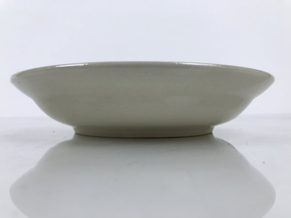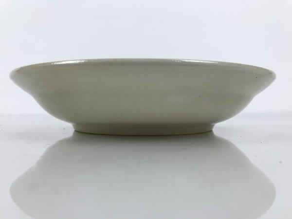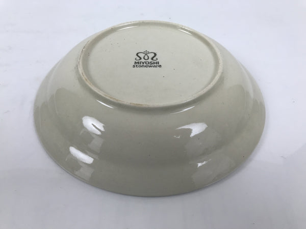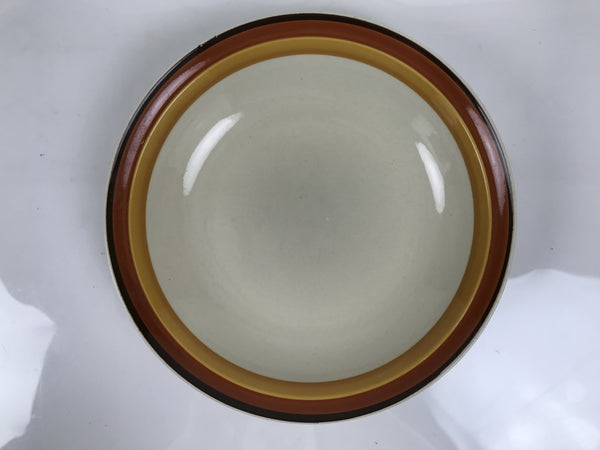 This item is a vintage Japanese stoneware bowl. This wide-mouthed, shallow bowl is mostly beige with a brown and yellow banded line along the inner rim. The back side has a Miyoshi stamp mark. Due to its shape, this type of bowl is excellent for pasta and salads.