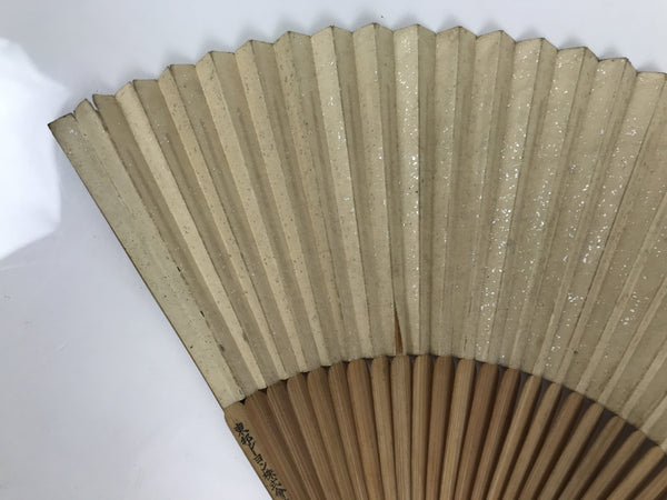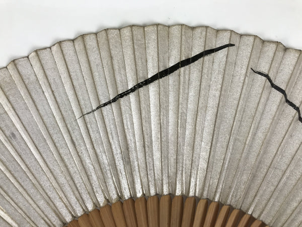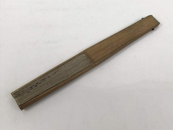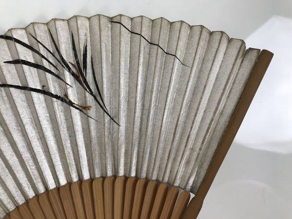 This is a traditional Japanese folding fan called sensu. You can use this when it's hot or as decoration. The front side of this paper fan features a silhouette of blades of grass on a silver background with a slight brown accent. The back side is a beige color with silver specks. It is made with a natural bamboo frame.