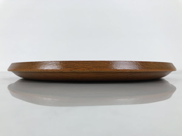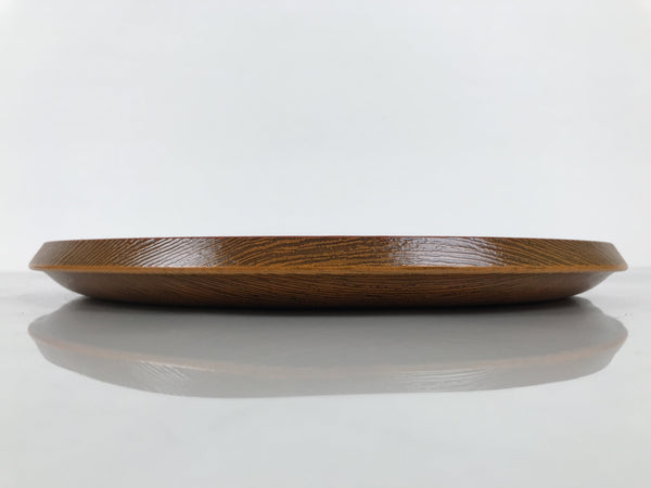 This vintage Japanese serving tray is made of resin. Made to mimic brushed lacquer, this tray is brown with faux wood grain and a red top edge. It is round with a short raised edge so drinks cannot easily slide off.