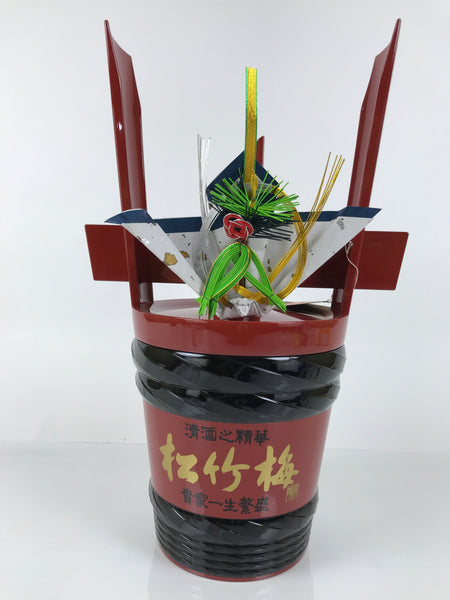 This is a vintage Japanese tsunodaru sake barrel used for celebratory events (such as weddings). It comprises a bottom and a lid with a handle. Originally, it had an inside glass bottle that fits this barrel for storing sake, though it is not included. It is made of resin, and paper with string decorates it. There is an open hole on the top to facilitate pouring sake, as well as a matching red plug. Black Kanji characters say the sake name and a word for celebrations.