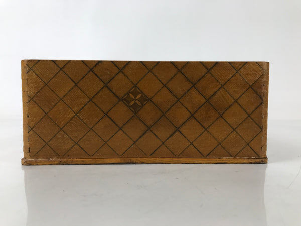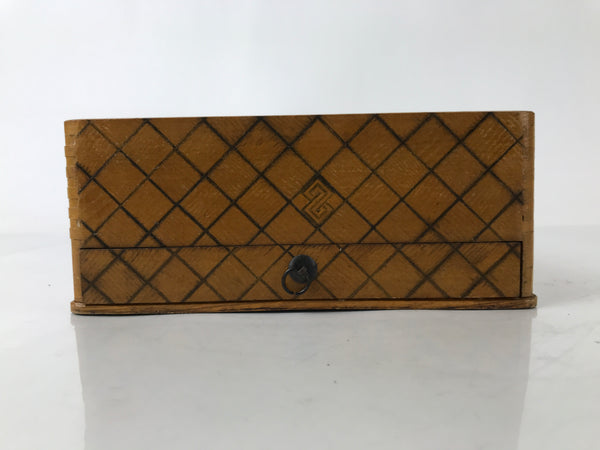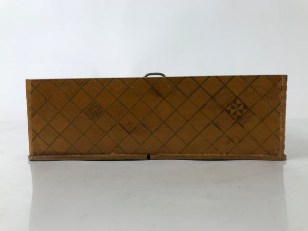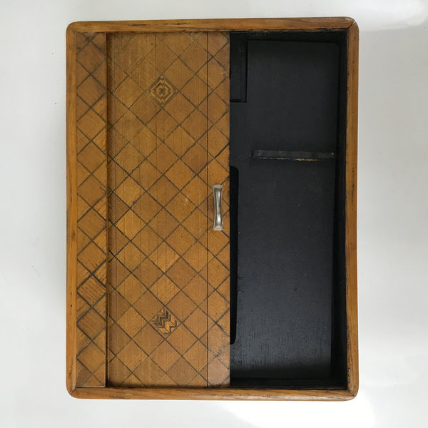 This is a vintage Japanese wooden portable calligraphy box. It is brushed with a clear lacquer and has a checkered design with some small patterned squares reminiscent of yosegi-zaiku puzzle boxes. It has a shutter lid with a small metal handle that rolls back to expose the inside. While the ink stone and other utensils are missing, there are specific cutout spots where they should be placed, including brush rests. There is an inner panel that is removable, likely for cleaning or adjustments. On the very bottom, there is a shallow drawer for paper, extra brushes, cloths, etc.