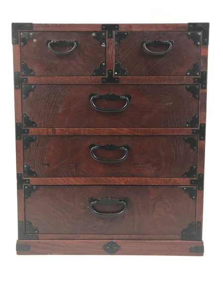 This is a vintage Japanese storage chest, also called tansu. A rich brown color with a brushed lacquer finish, this small chest has two half-sized drawers and three full-width drawers with simple black metal hardware. All corners, as well as the inside front-panel corners of each drawer have black metal embellishments for extra appeal. This particular design style is called sendai. This beautiful tansu chest can be used for storing sewing supplies, jewelry, or other trinkets.