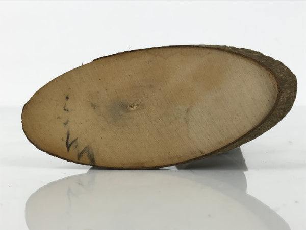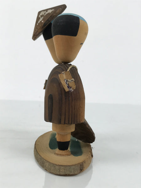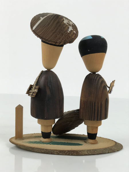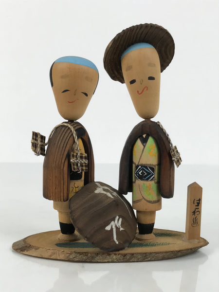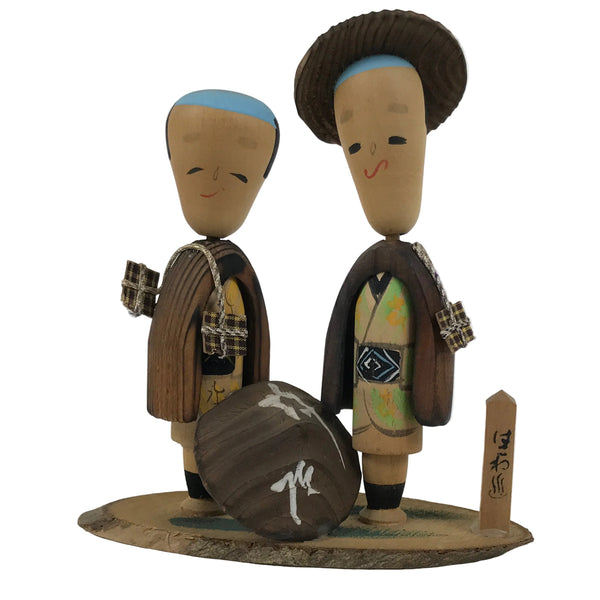 This is a vintage Japanese wooden doll figurine from Hakone, Kanagawa. A pair of men figurines and a small wooden sign sit on a wooden slice base. These wobbly-head figurines have old Japanese hairstyles and are in a travelling outfit, a hat, a coat, long pants, and a carrying bag. The sign says the hot spring's name.